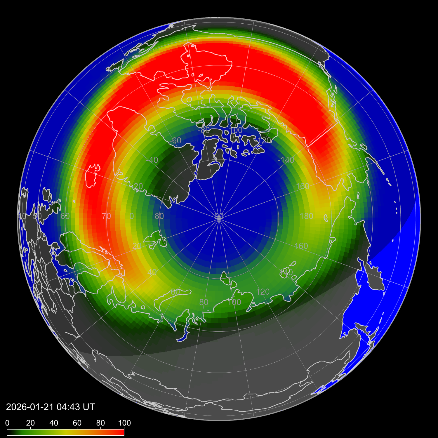 Изменения и часовой прогноз индекса интенсивности полярных сияний с 2026-01-22 по 2026-01-23