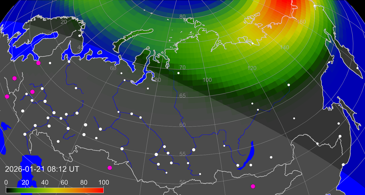 Индекс интенсивности полярных сияний и теоретически возможная широта наблюдений для ночного времени в восточном полушарии