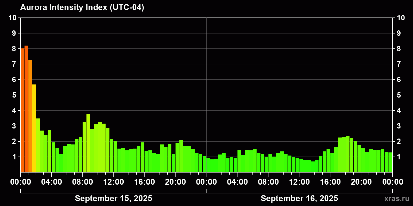 Auroral intensity index and the theoretically possible latitude of observations for nighttime in the Western Hemisphere as of 2025-09-16 23:45 (end of day) local time
