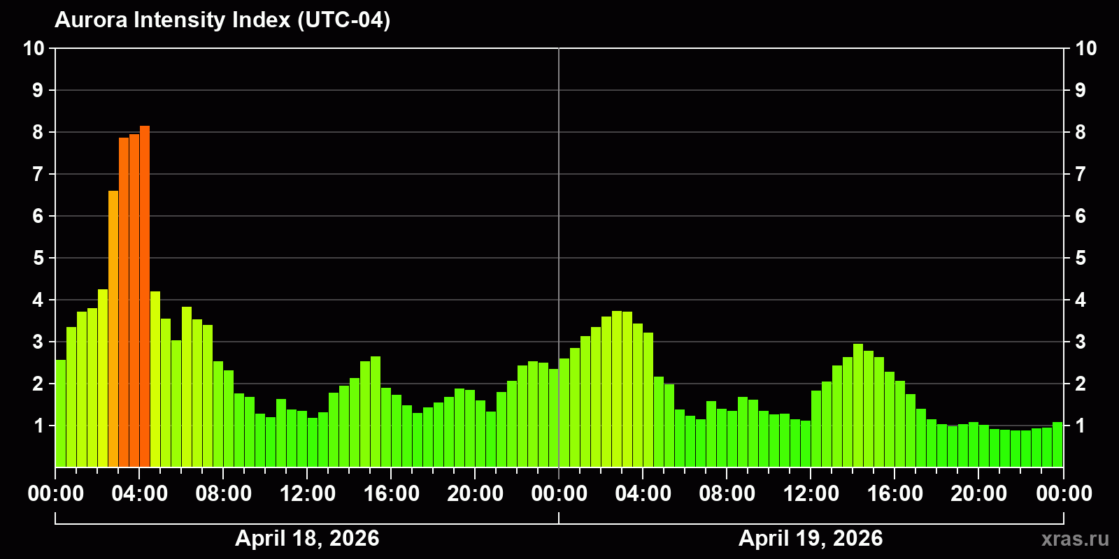 Changes in the auroral intensity index from 2026-04-18 to 2026-04-19 local time