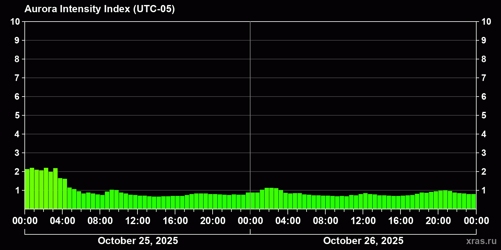 Auroral intensity index and the theoretically possible latitude of observations for nighttime in the Western Hemisphere as of 2025-10-26 23:41 (end of day) local time