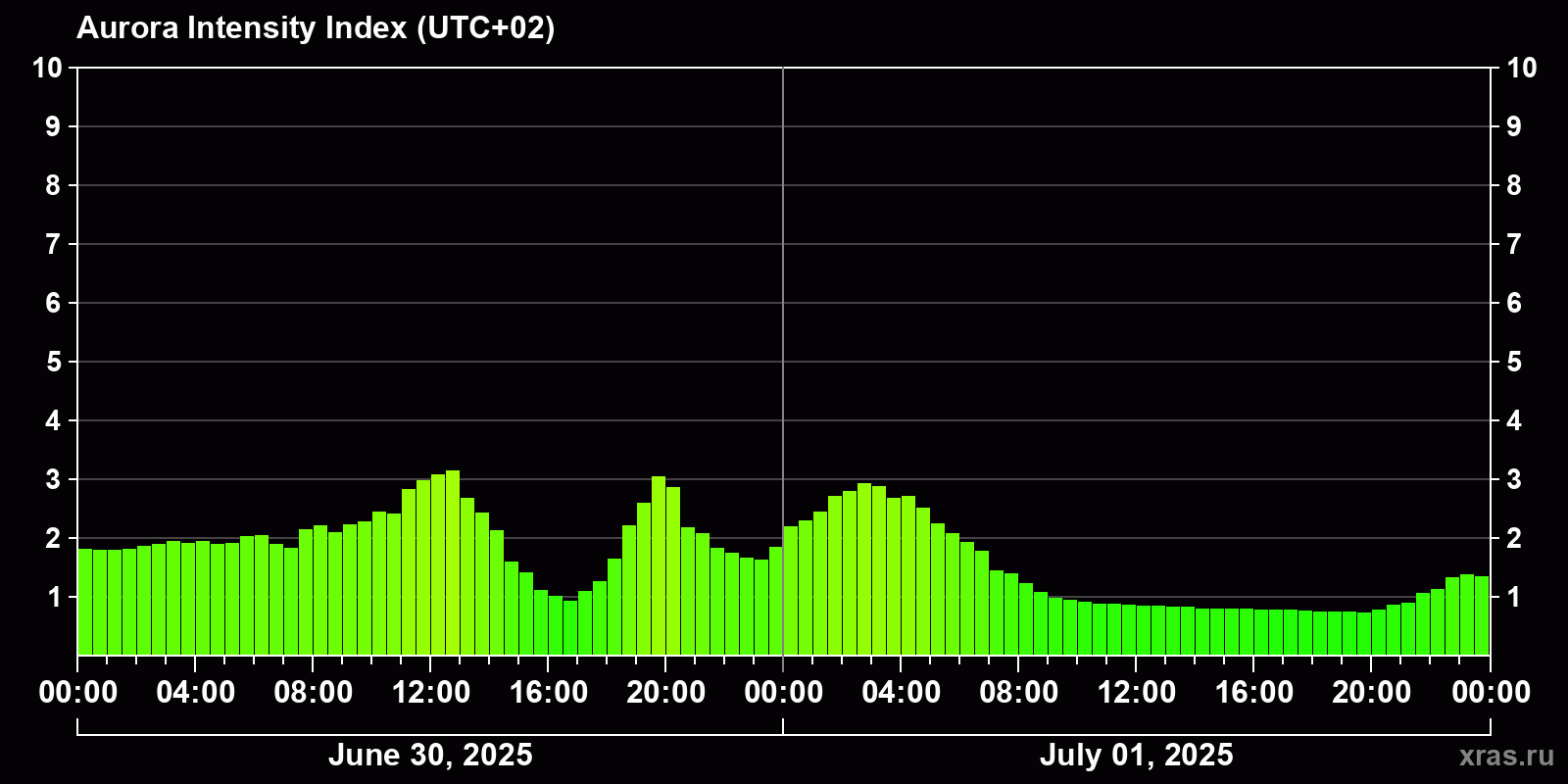 Changes in the auroral intensity index from 2025-06-30 to 2025-07-01 local time