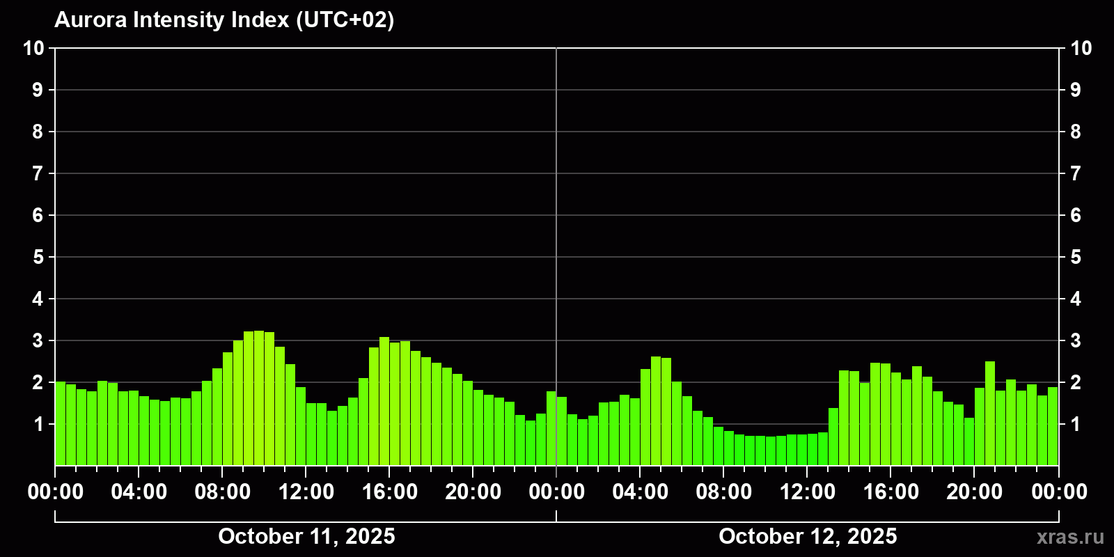 Changes in the auroral intensity index from 2025-10-11 to 2025-10-12 local time
