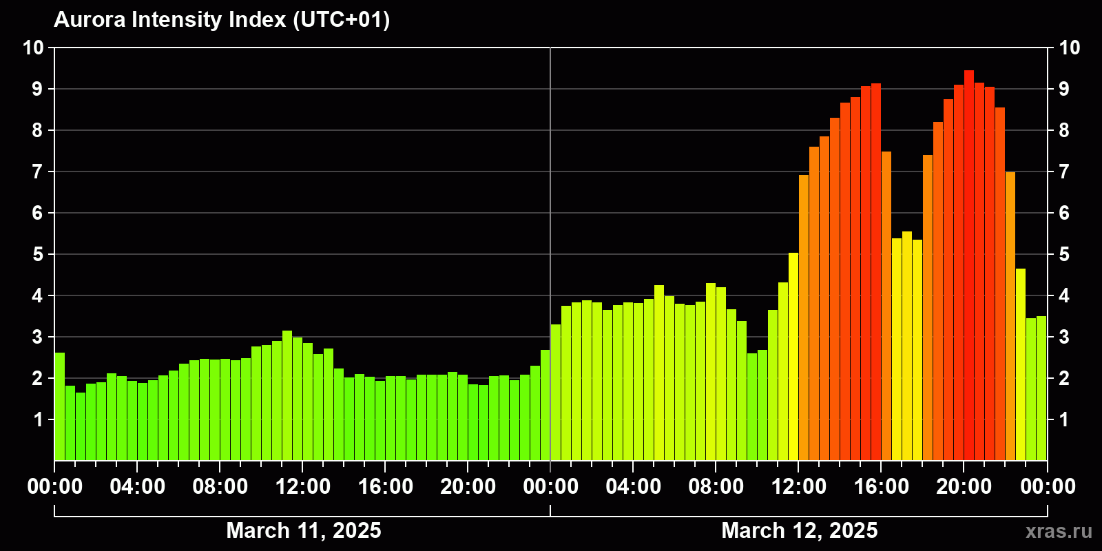 Changes in the auroral intensity index from 2025-03-11 to 2025-03-12 local time