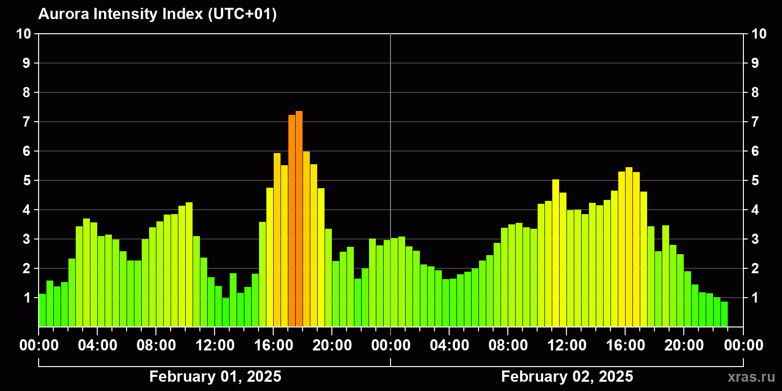 Changes in the auroral intensity index from 2025-02-01 to 2025-02-02 local time