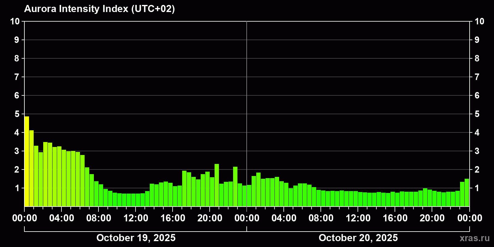 Changes in the auroral intensity index from 2025-10-19 to 2025-10-20 local time