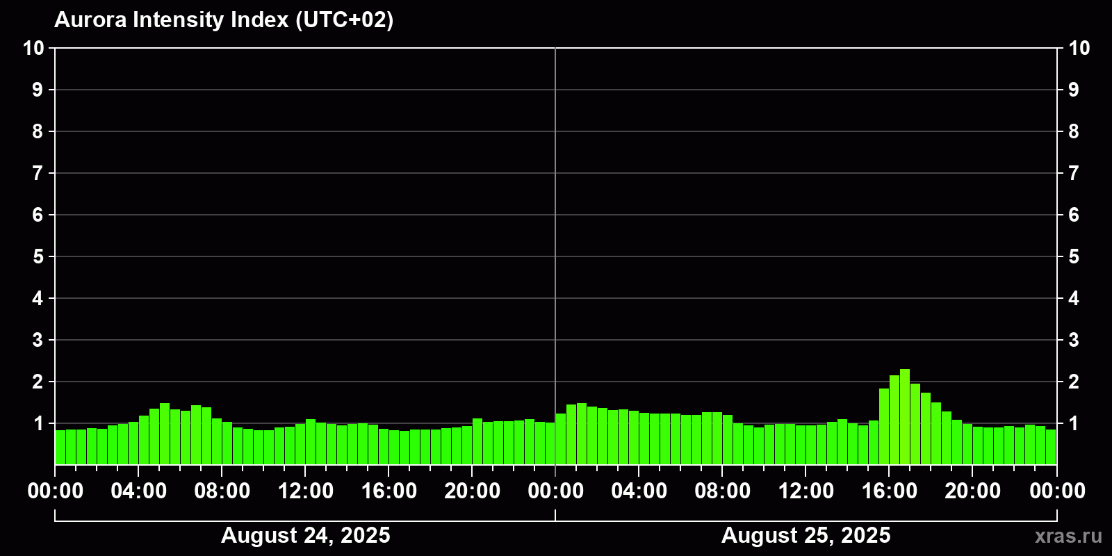 Auroral intensity index and the theoretically possible latitude of observations for nighttime in the Estern Hemisphere as of 2025-08-25 23:52 (end of day) local time
