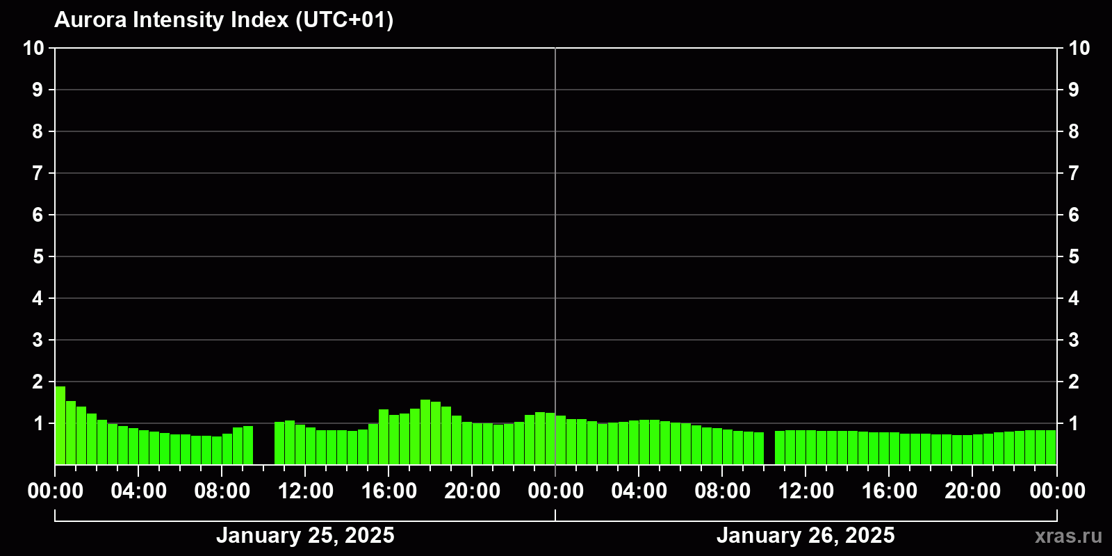 Changes in the auroral intensity index from 2025-01-25 to 2025-01-26 local time