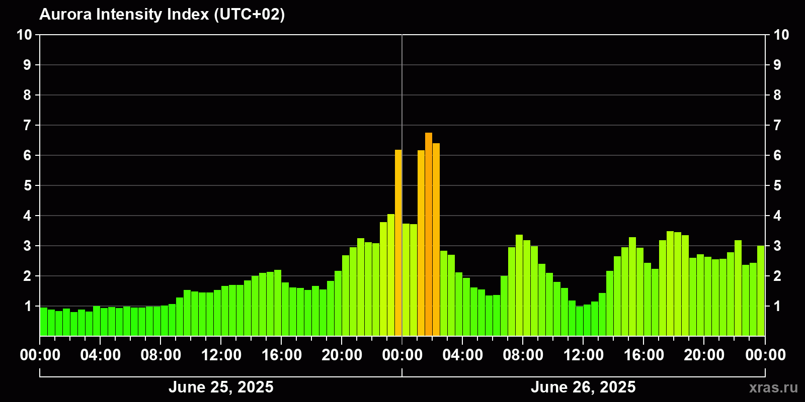 Auroral intensity index and the theoretically possible latitude of observations for nighttime in the Estern Hemisphere as of 2025-06-26 23:57 (end of day) local time