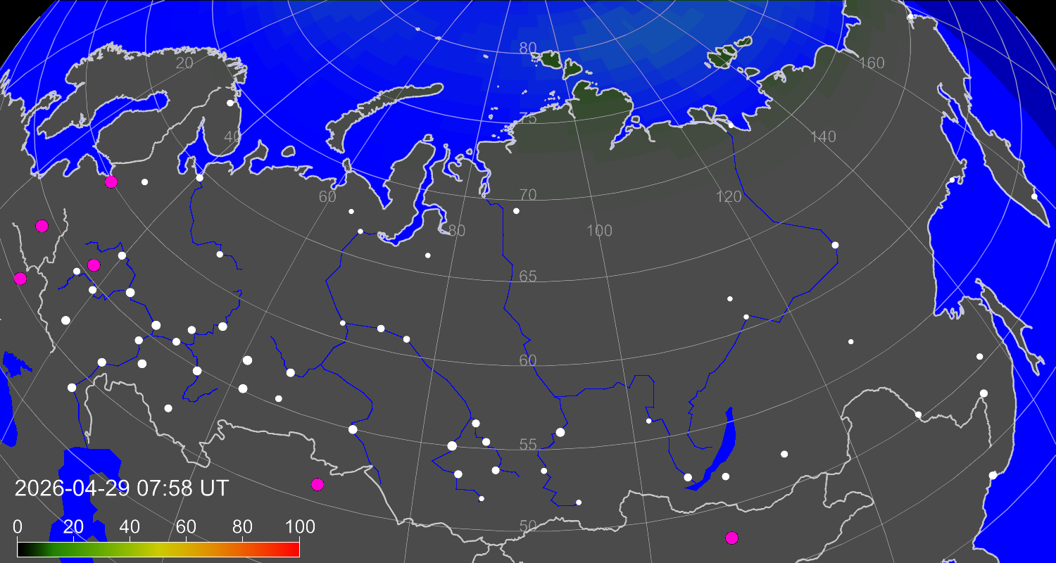 Probability of northern lights (auroras) in cities of Russia