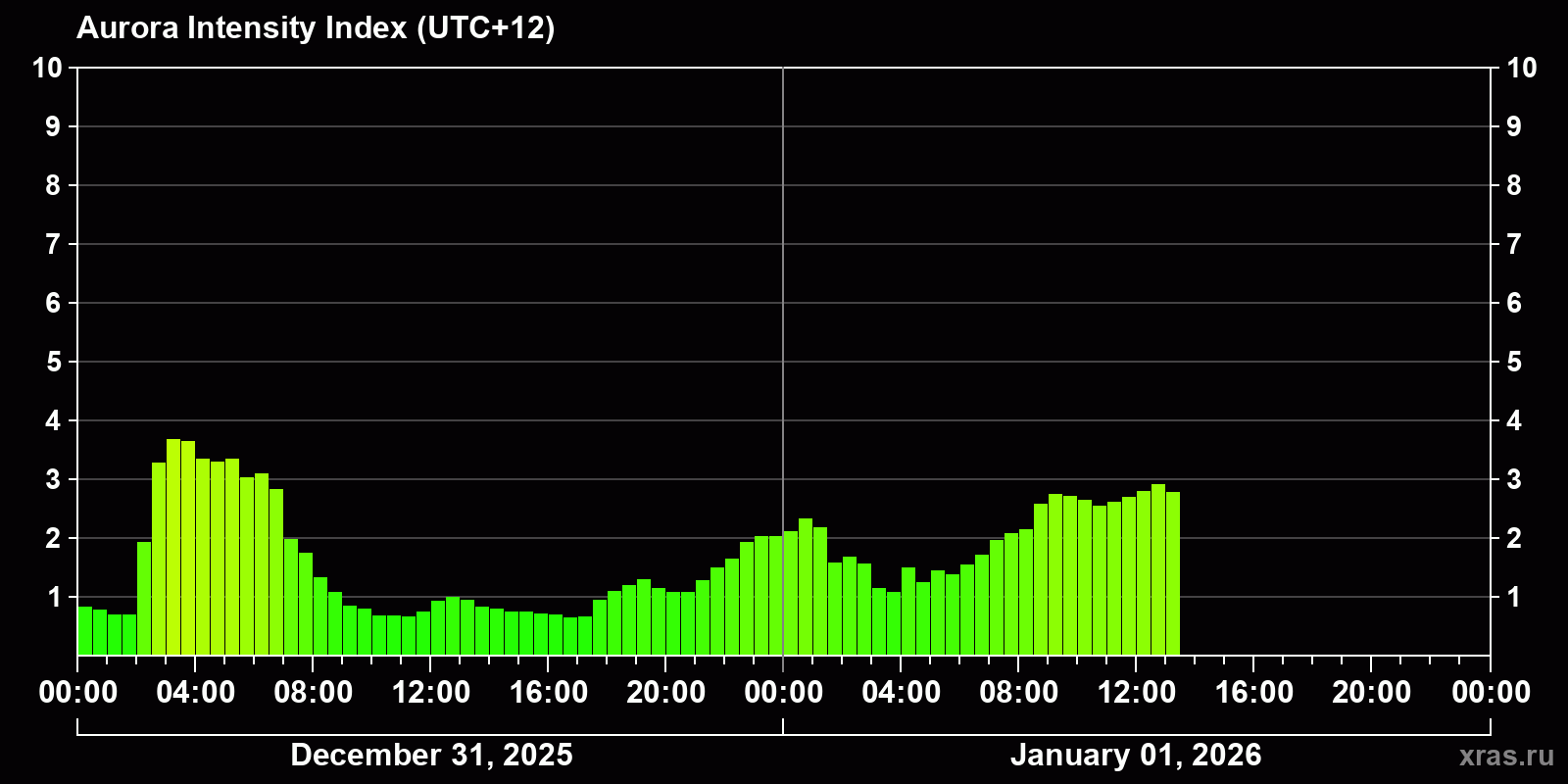 Auroral intensity index and the theoretically possible latitude of observations for nighttime in the Estern Hemisphere as of 2026-01-01 09:14 (end of day) local time