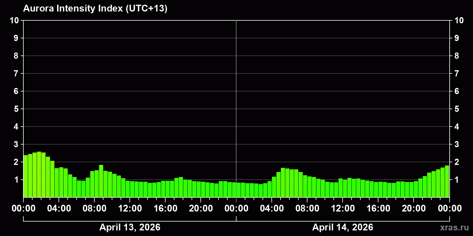 Changes in the auroral intensity index from 2026-04-13 to 2026-04-14 local time