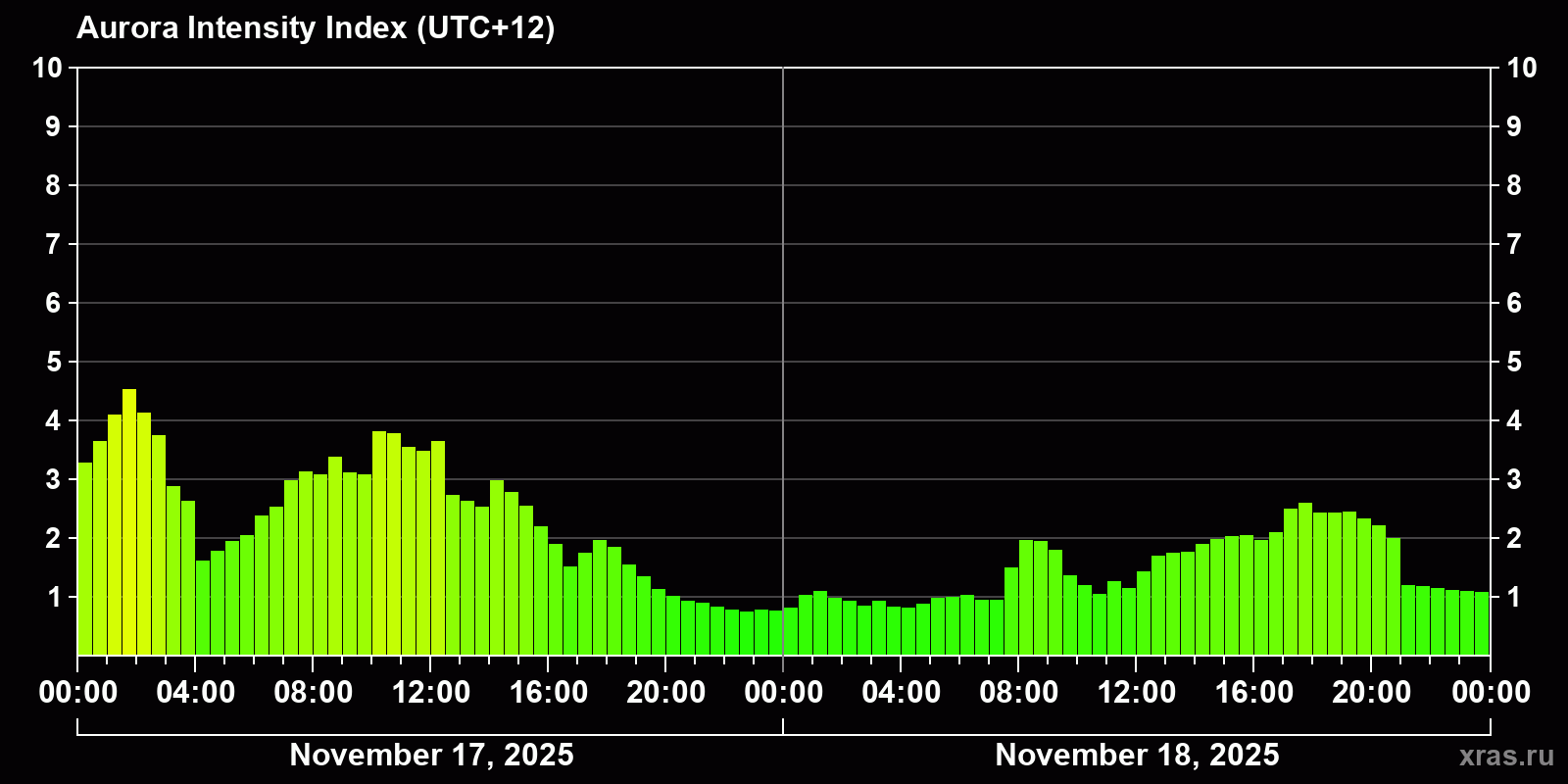 Auroral intensity index and the theoretically possible latitude of observations for nighttime in the Estern Hemisphere as of 2025-11-18 23:58 (end of day) local time