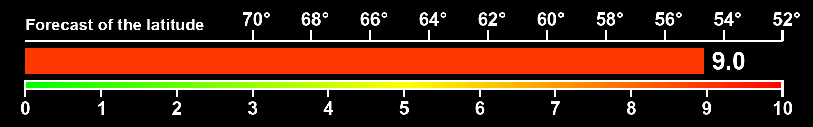 Auroral intensity index and the theoretically possible latitude of observations for nighttime in the Estern Hemisphere as of 2026-04-02 23:45 (end of day) local time