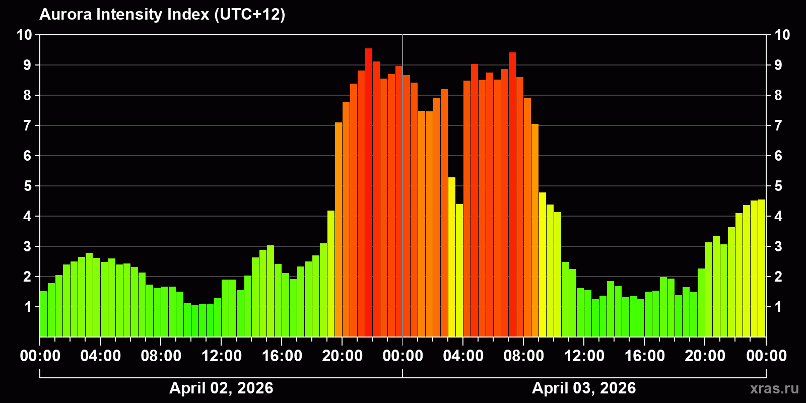 Changes in the auroral intensity index from 2026-04-02 to 2026-04-03 local time