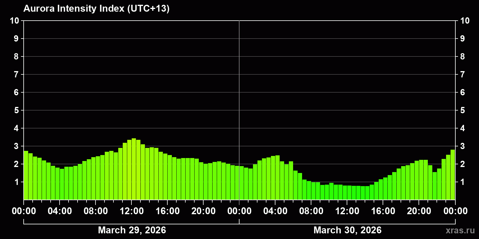 Auroral intensity index and the theoretically possible latitude of observations for nighttime in the Estern Hemisphere as of 2026-03-30 22:48 (end of day) local time