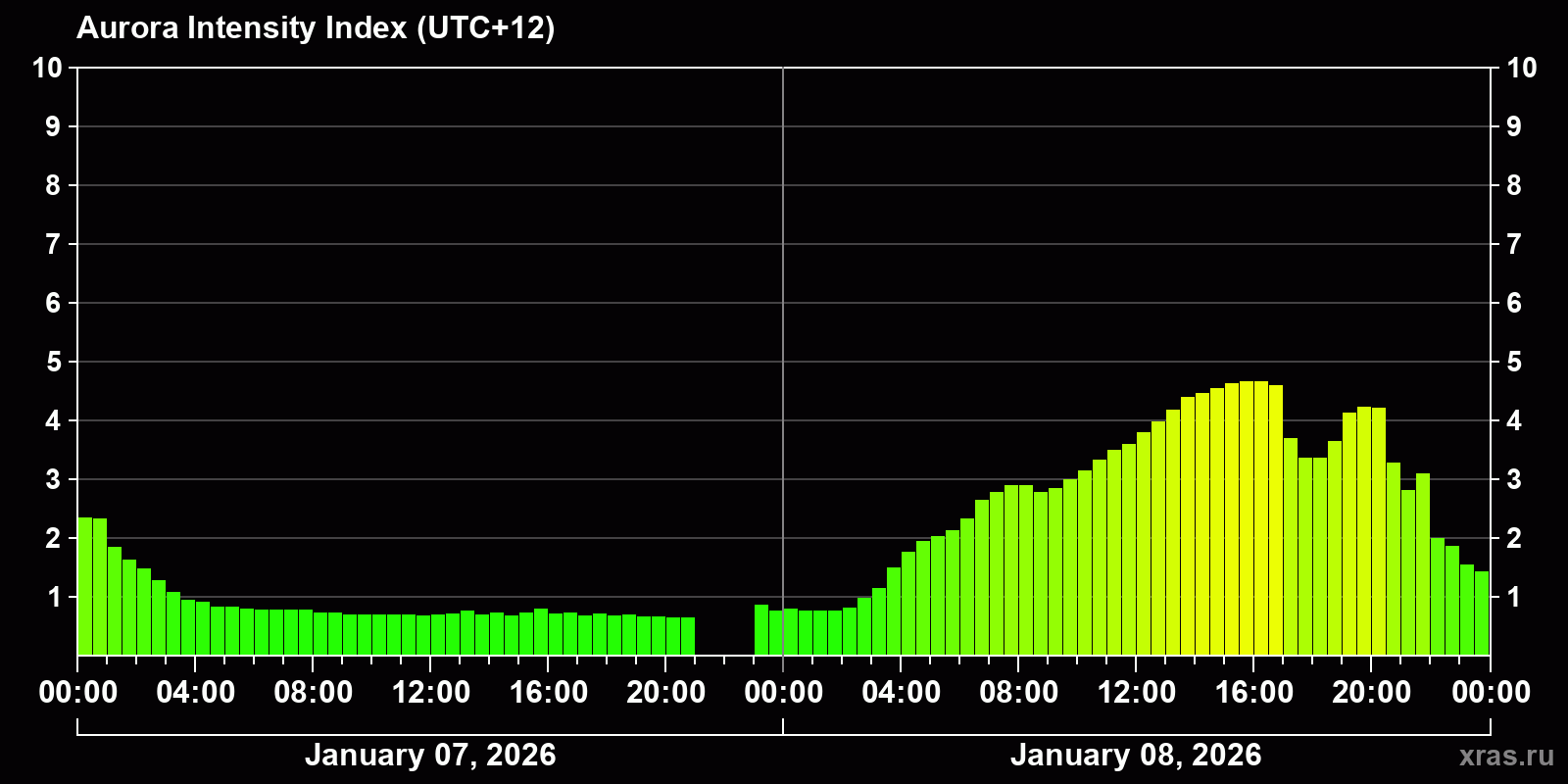 Auroral intensity index and the theoretically possible latitude of observations for nighttime in the Estern Hemisphere as of 2026-01-08 23:47 (end of day) local time
