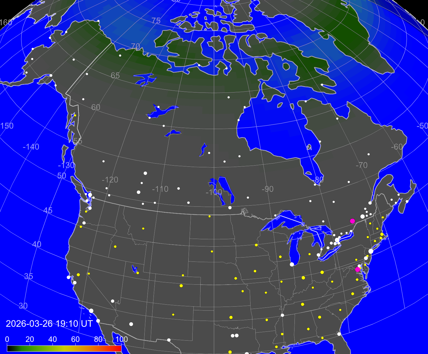 Изменения и часовой прогноз индекса интенсивности полярных сияний с 2026-03-25 по 2026-03-26