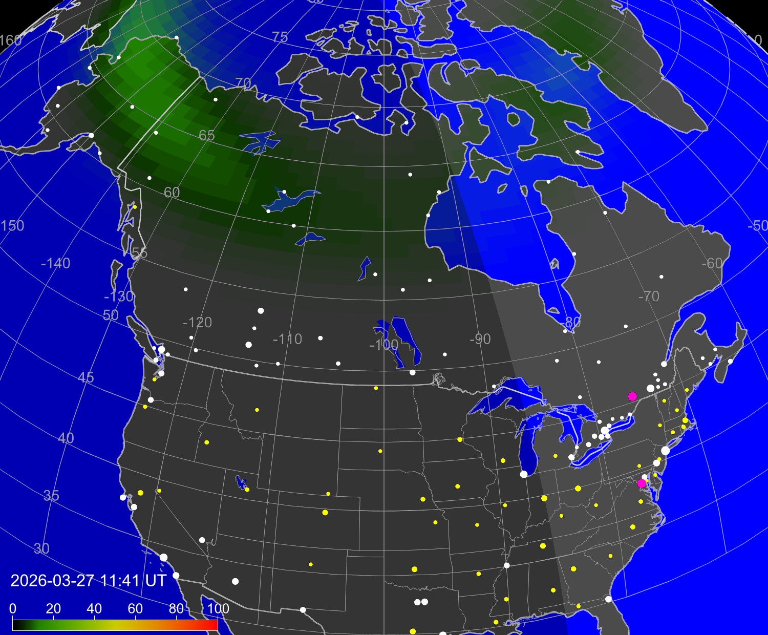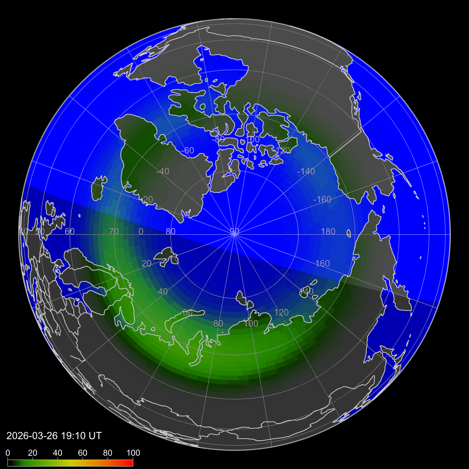 Индекс интенсивности полярных сияний и теоретически возможная широта наблюдений для ночного времени в западном полушарии
