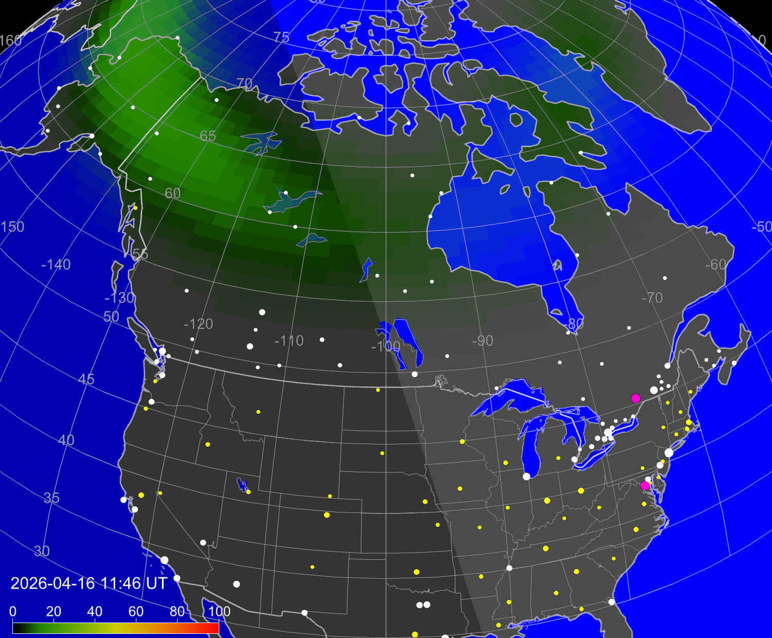 Probability of northern lights (auroras) in cities of United States