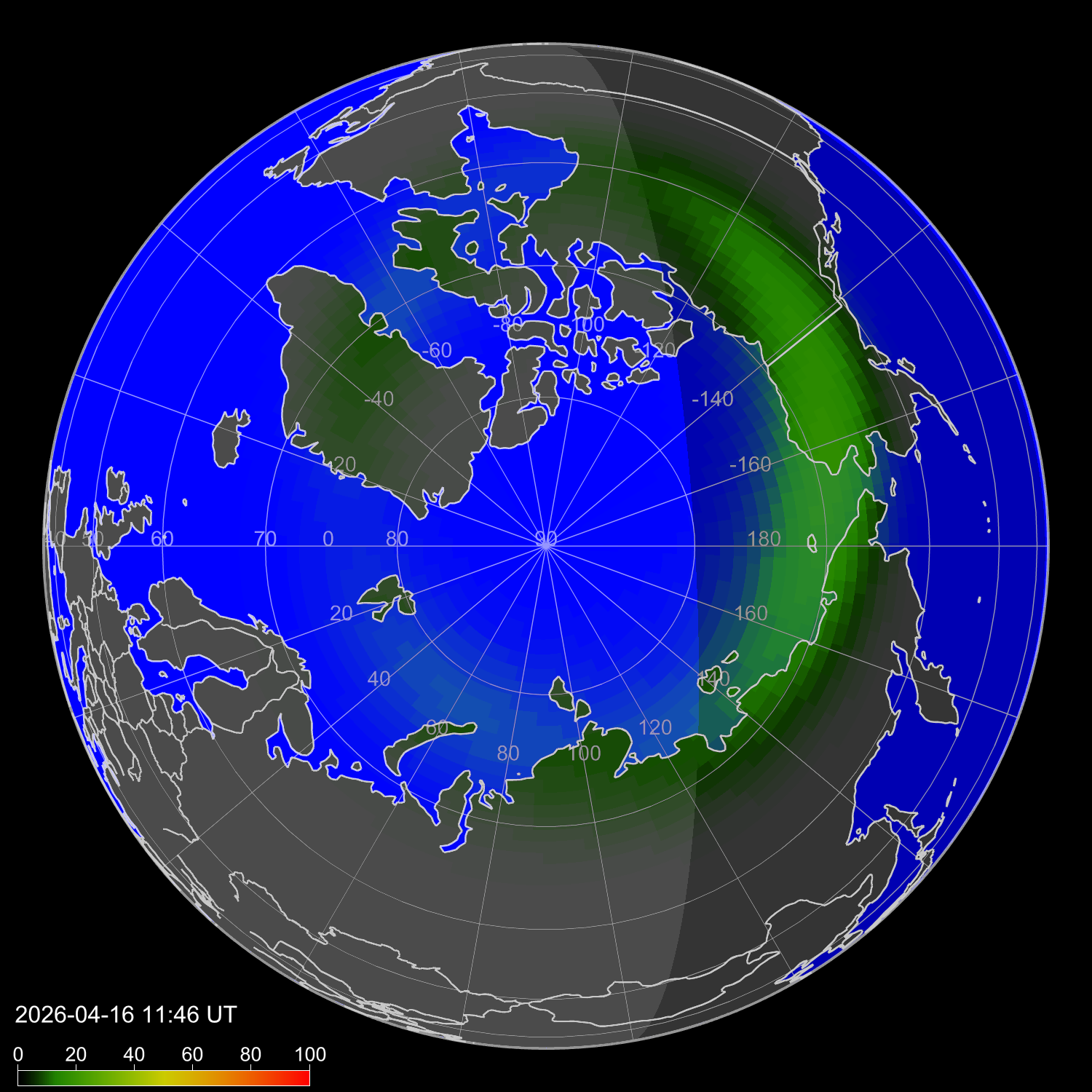 Auroral intensity index and theoretically possible latitude of observations for nighttime in the Western Hemisphere