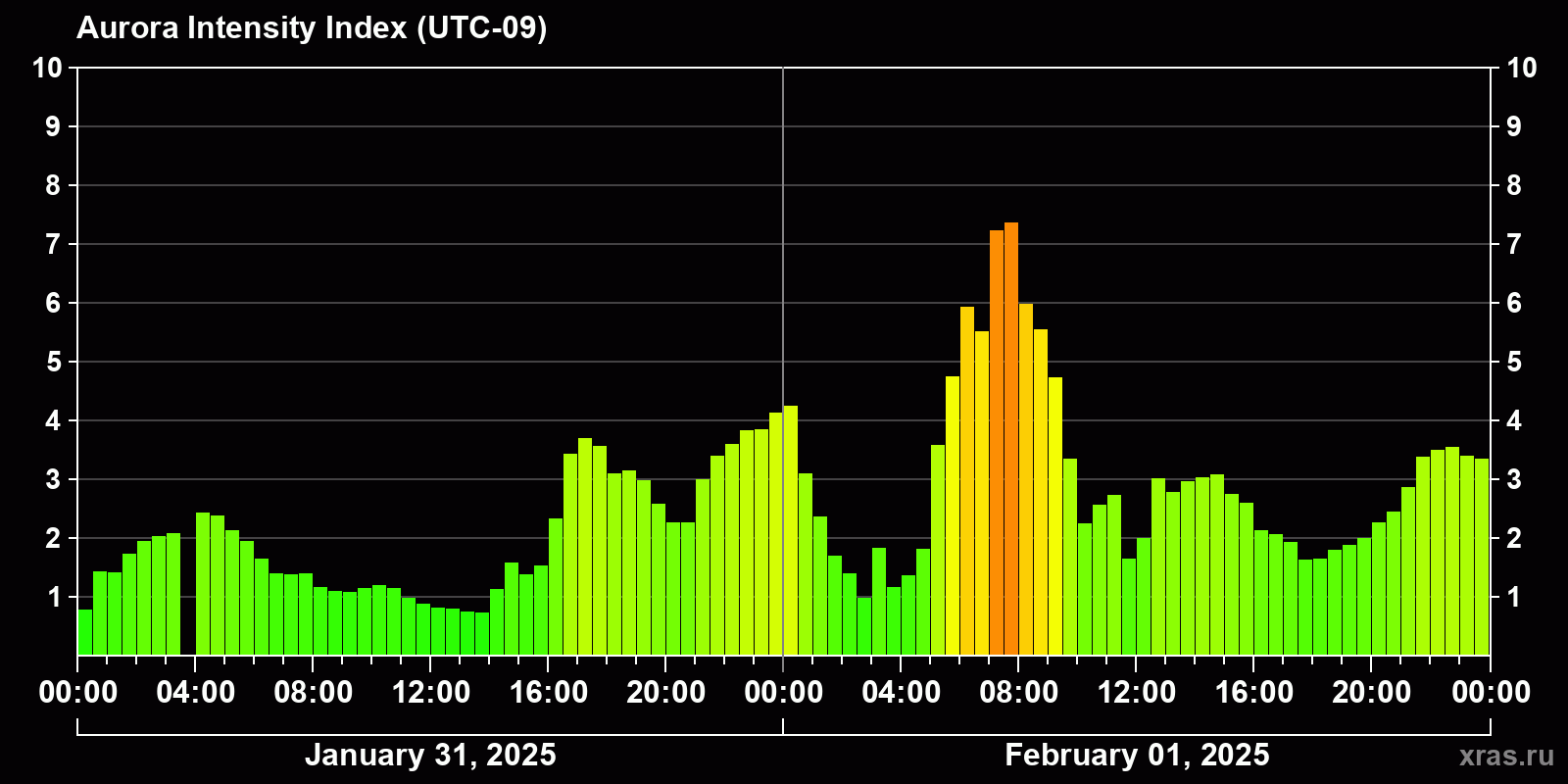 Changes in the auroral intensity index from 2025-01-31 to 2025-02-01 local time
