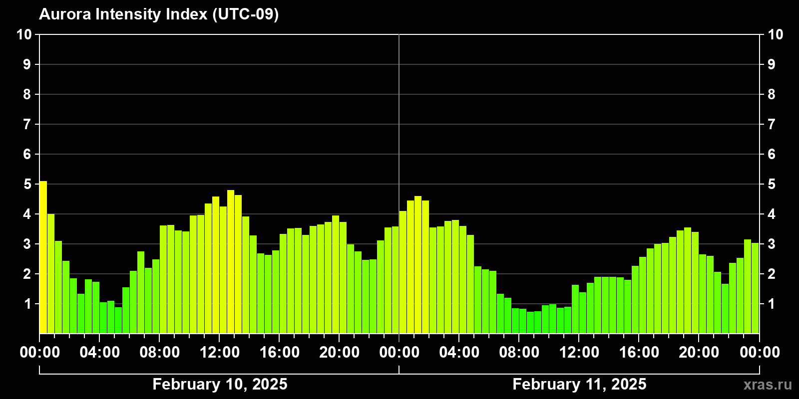 Changes in the auroral intensity index from 2025-02-10 to 2025-02-11 local time