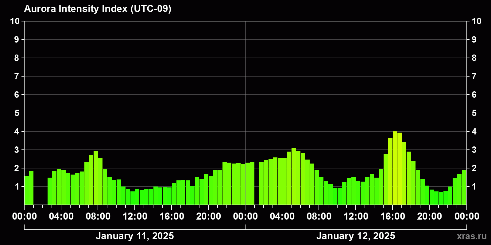 Changes in the auroral intensity index from 2025-01-11 to 2025-01-12 local time
