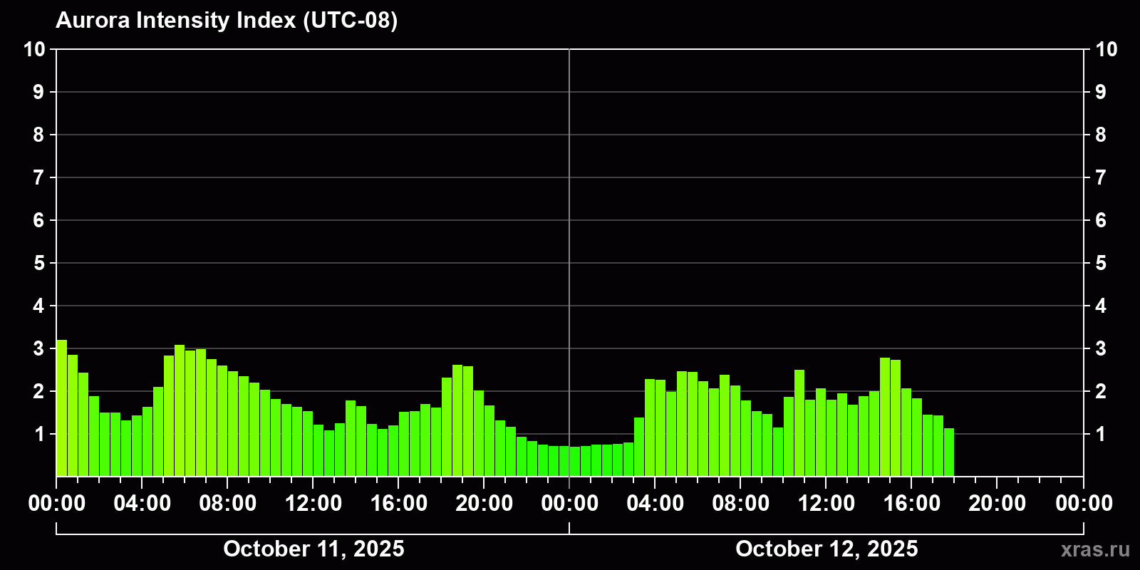 Auroral intensity index and the theoretically possible latitude of observations for nighttime in the Western Hemisphere as of 2025-10-12 15:21 (end of day) local time