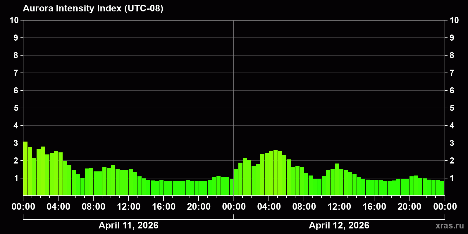 Changes in the auroral intensity index from 2026-04-11 to 2026-04-12 local time