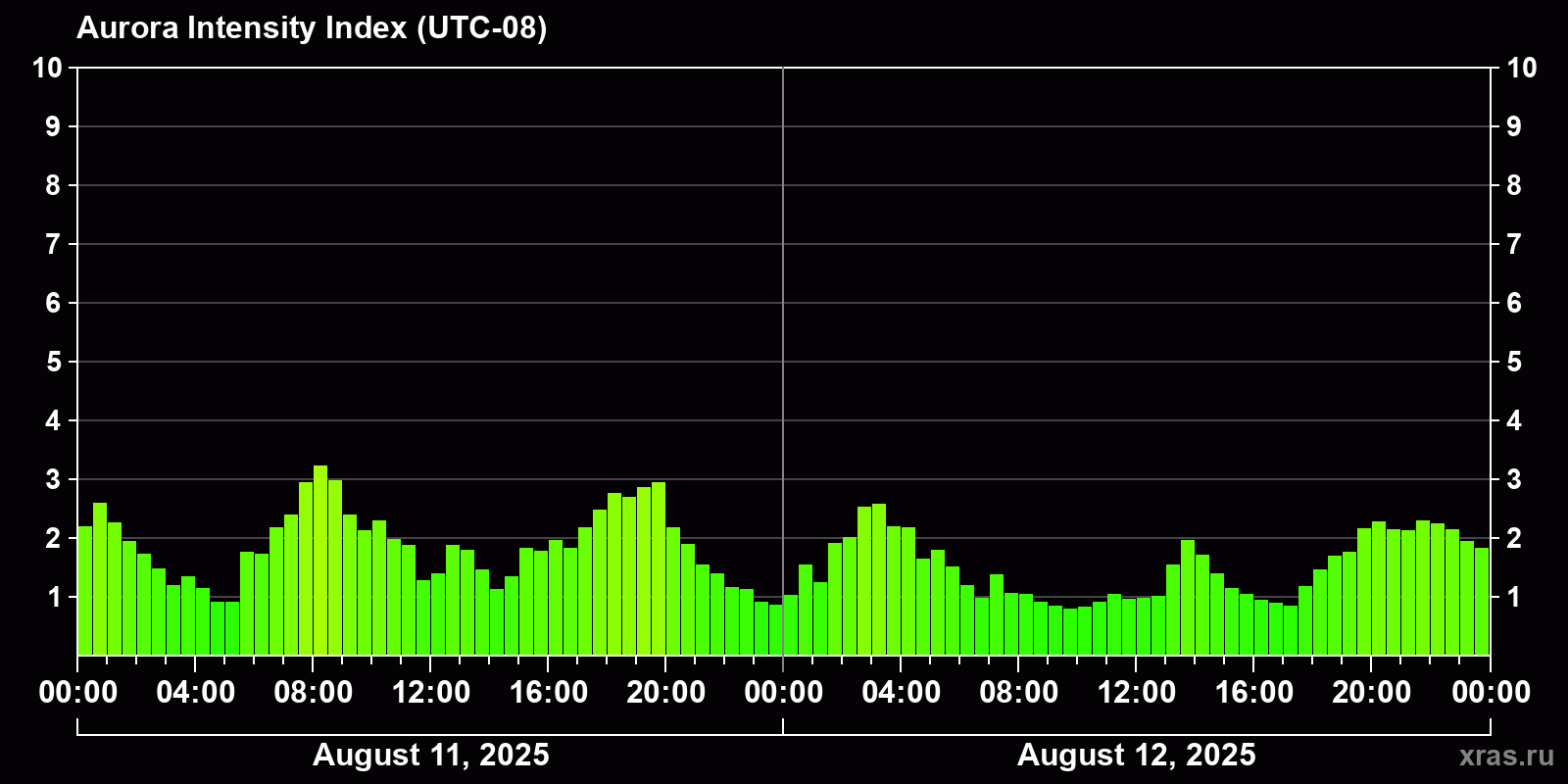 Changes in the auroral intensity index from 2025-08-11 to 2025-08-12 local time