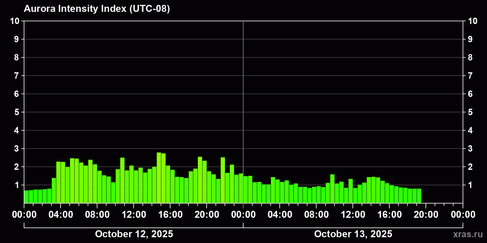 Changes in the auroral intensity index from 2025-10-12 to 2025-10-13 local time