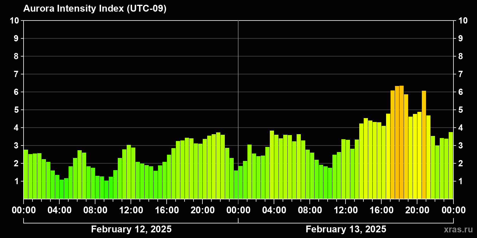 Changes in the auroral intensity index from 2025-02-12 to 2025-02-13 local time