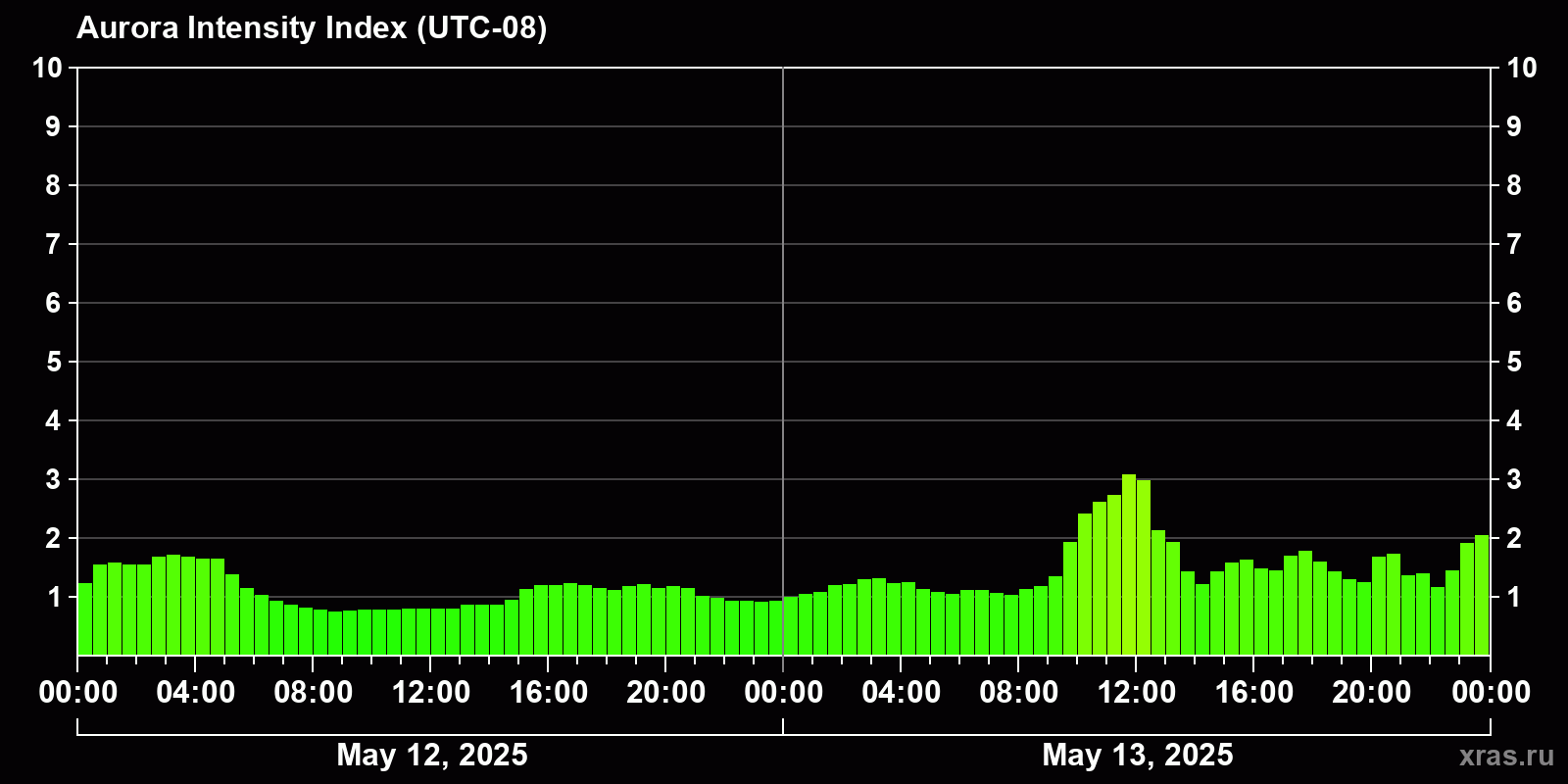 Changes in the auroral intensity index from 2025-05-12 to 2025-05-13 local time