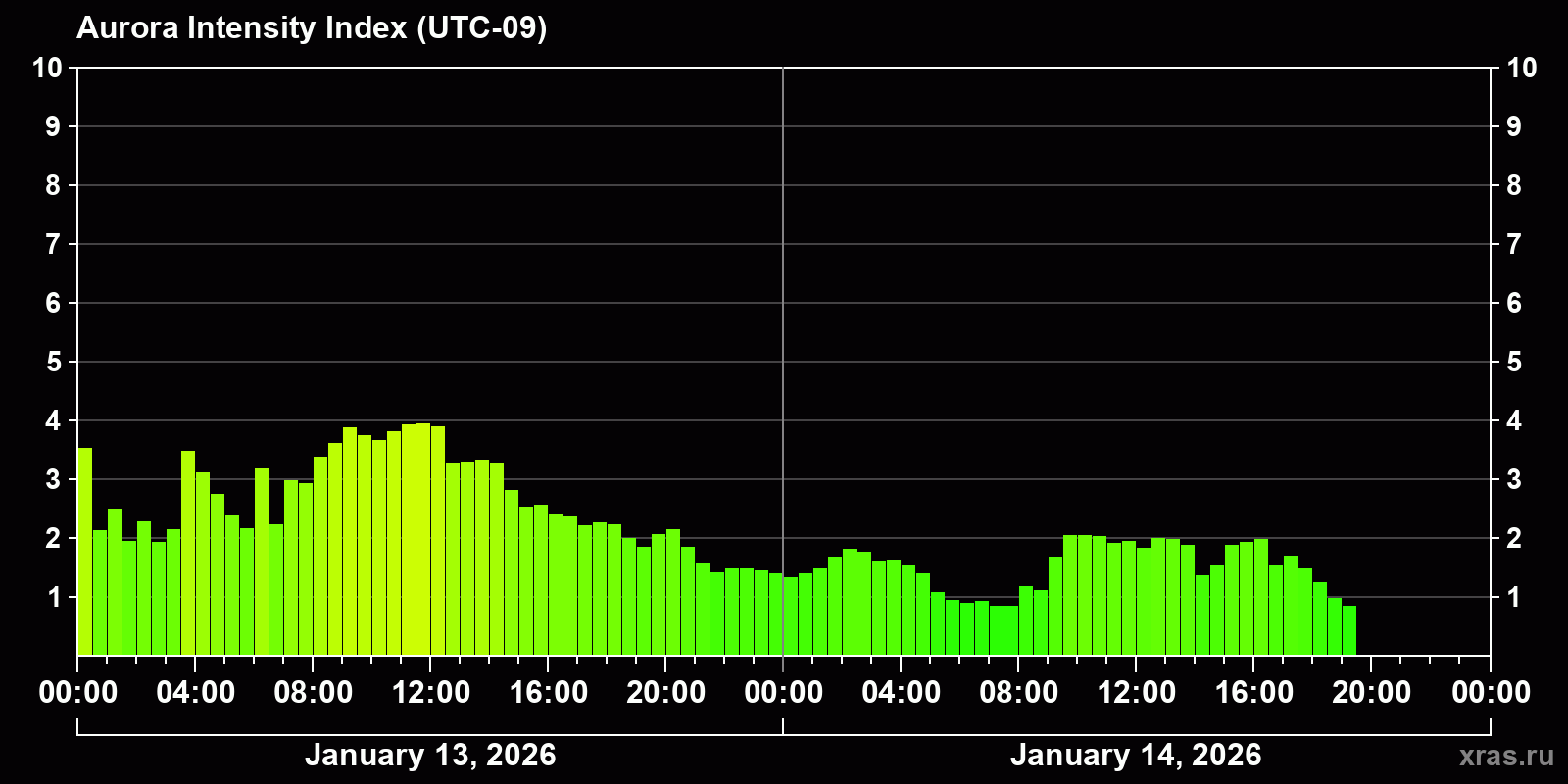 Auroral intensity index and the theoretically possible latitude of observations for nighttime in the Western Hemisphere as of 2026-01-14 14:11 (end of day) local time
