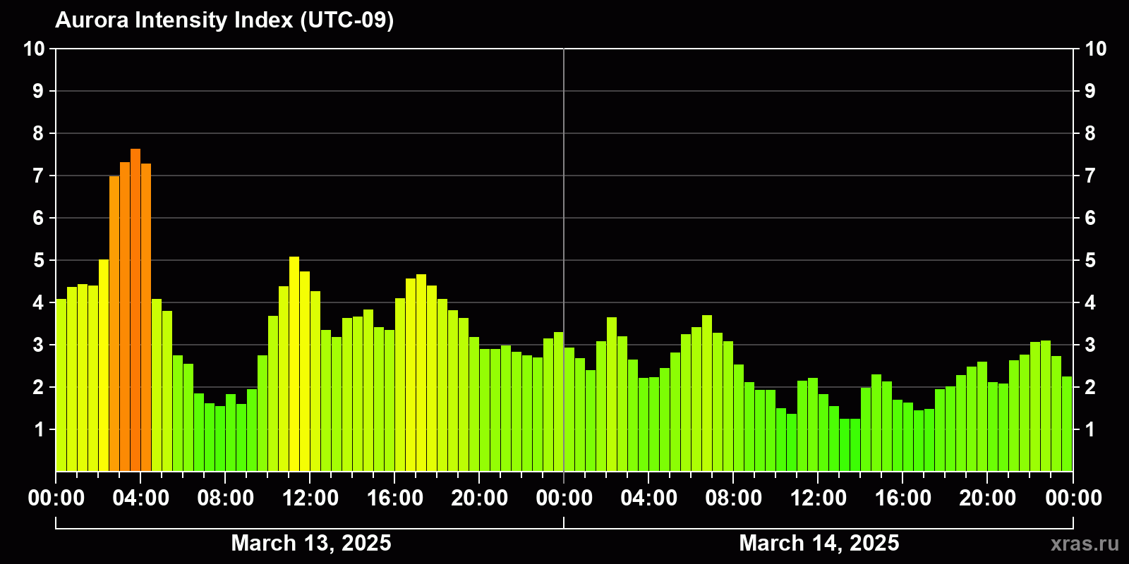 Changes in the auroral intensity index from 2025-03-13 to 2025-03-14 local time
