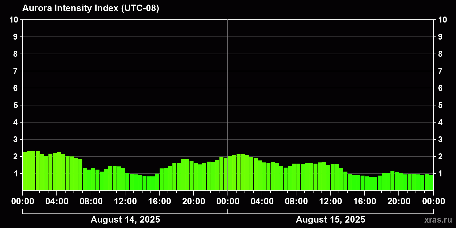 Auroral intensity index and the theoretically possible latitude of observations for nighttime in the Western Hemisphere as of 2025-08-15 23:59 (end of day) local time