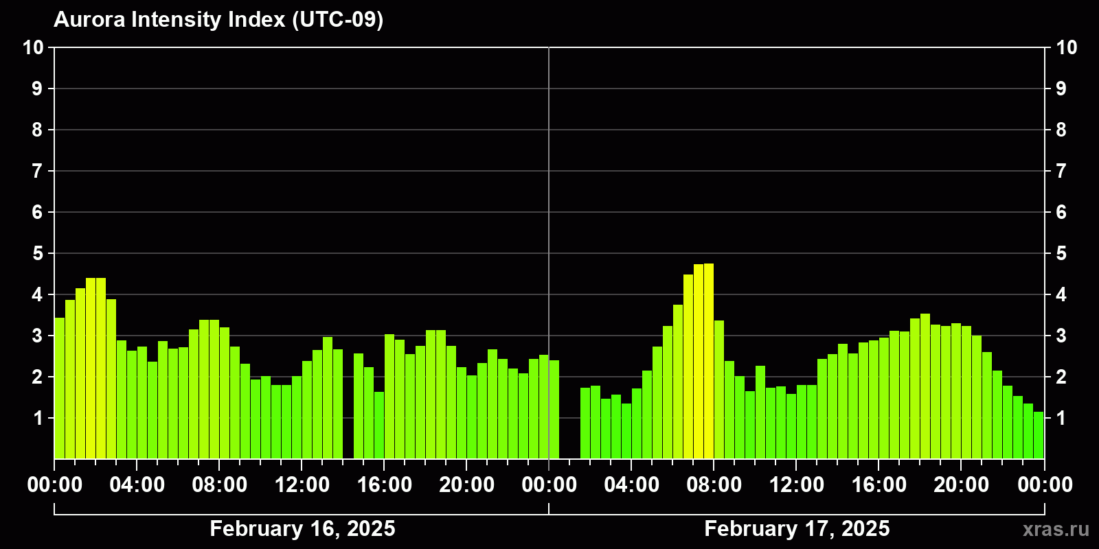 Auroral intensity index and the theoretically possible latitude of observations for nighttime in the Western Hemisphere as of 2025-02-17 23:53 (end of day) local time
