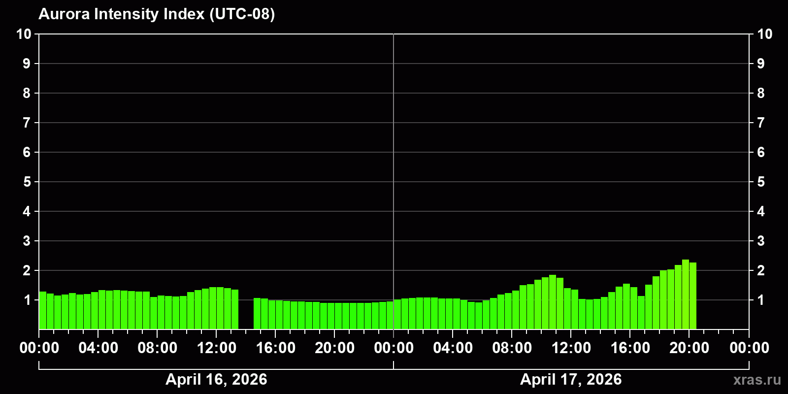 Changes in the auroral intensity index from 2026-04-16 to 2026-04-17 local time