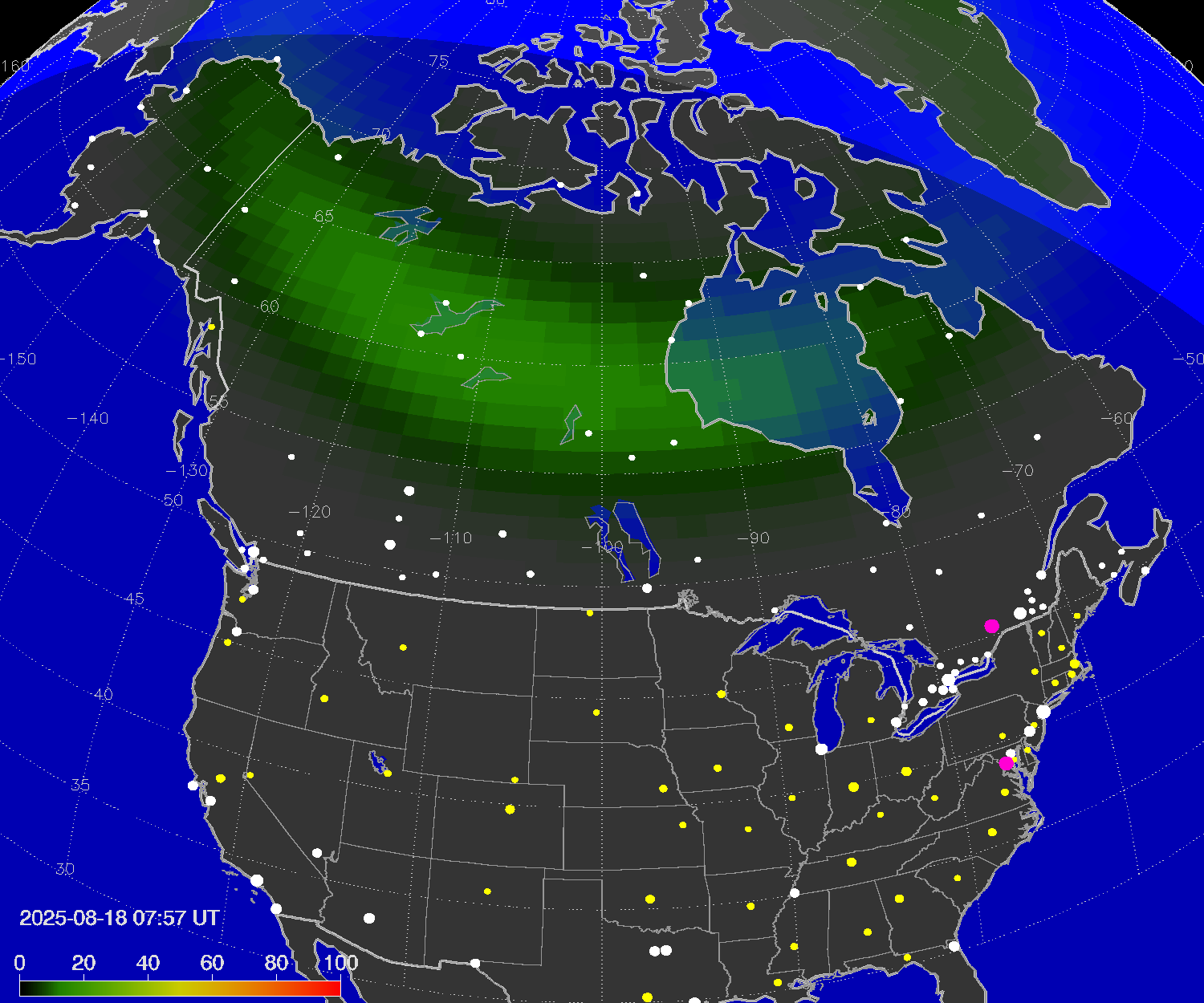 Probability of northern lights (auroras) in cities of United States