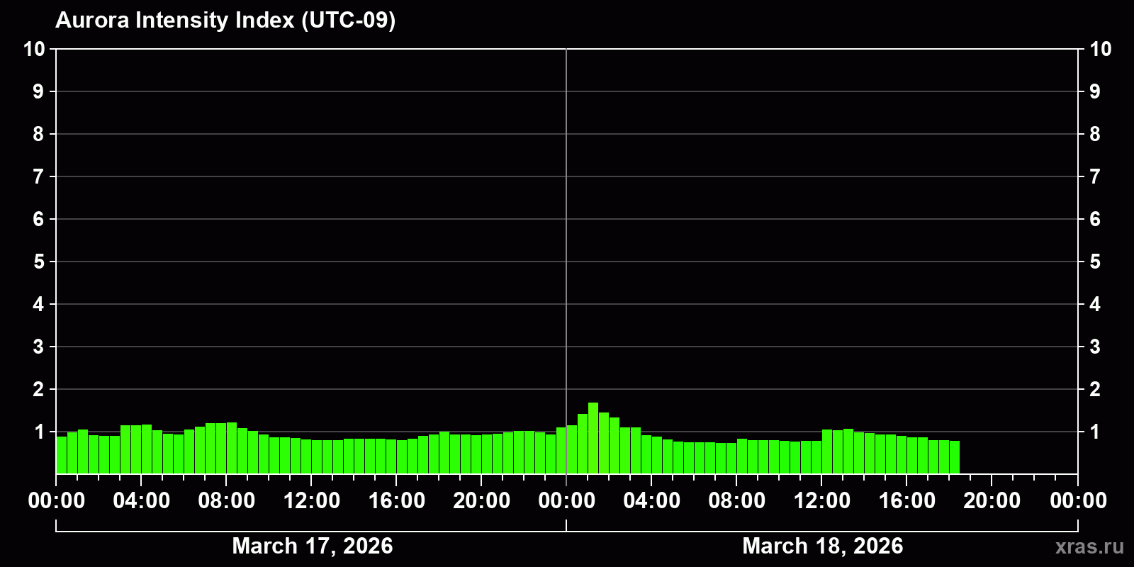 Changes in the auroral intensity index from 2026-03-17 to 2026-03-18 local time
