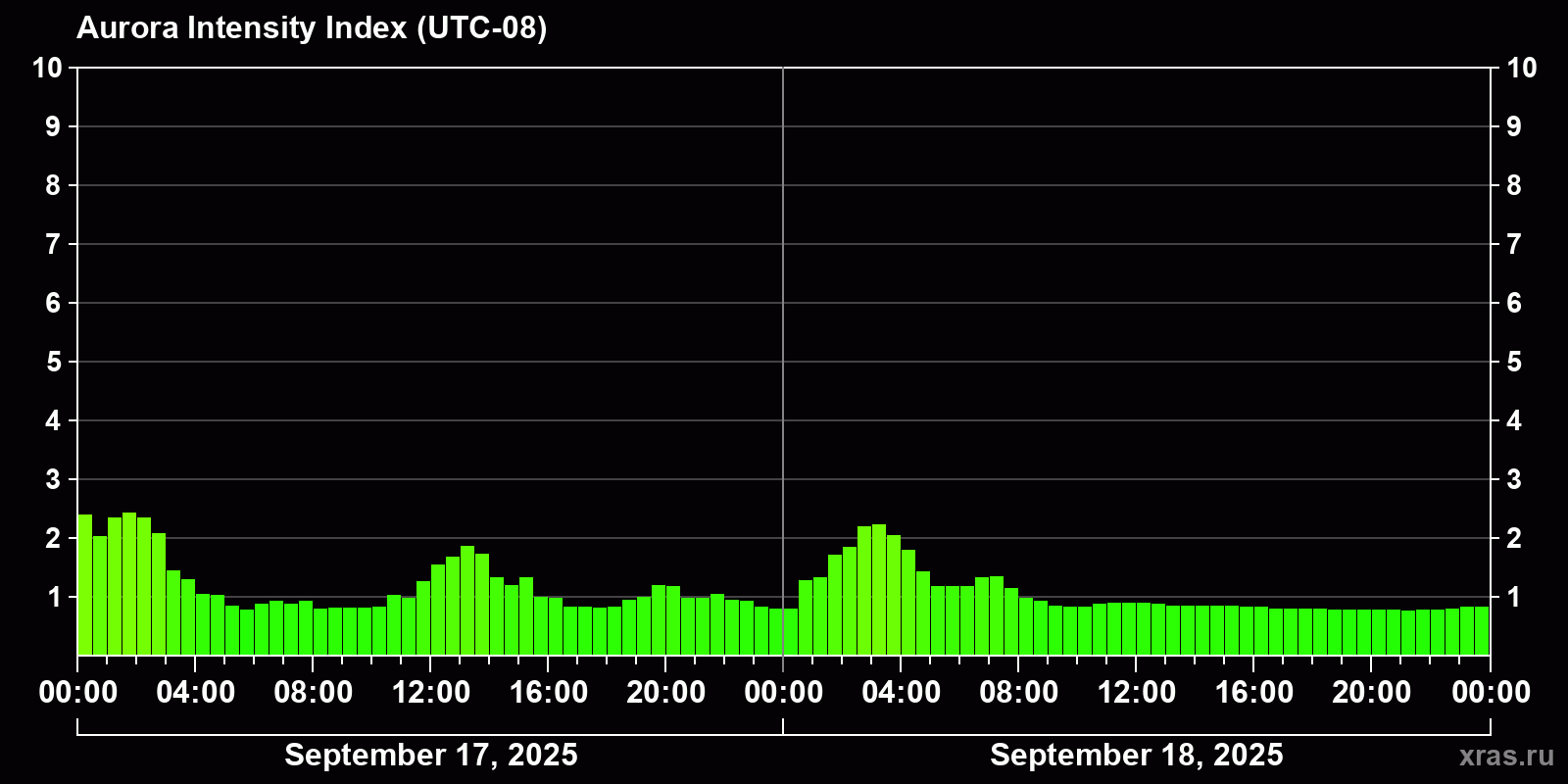 Changes in the auroral intensity index from 2025-09-17 to 2025-09-18 local time