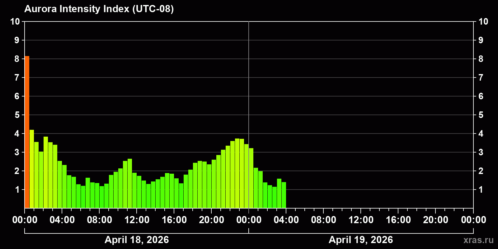 Auroral intensity index and the theoretically possible latitude of observations for nighttime in the Western Hemisphere as of 2026-04-19 02:25 (end of day) local time