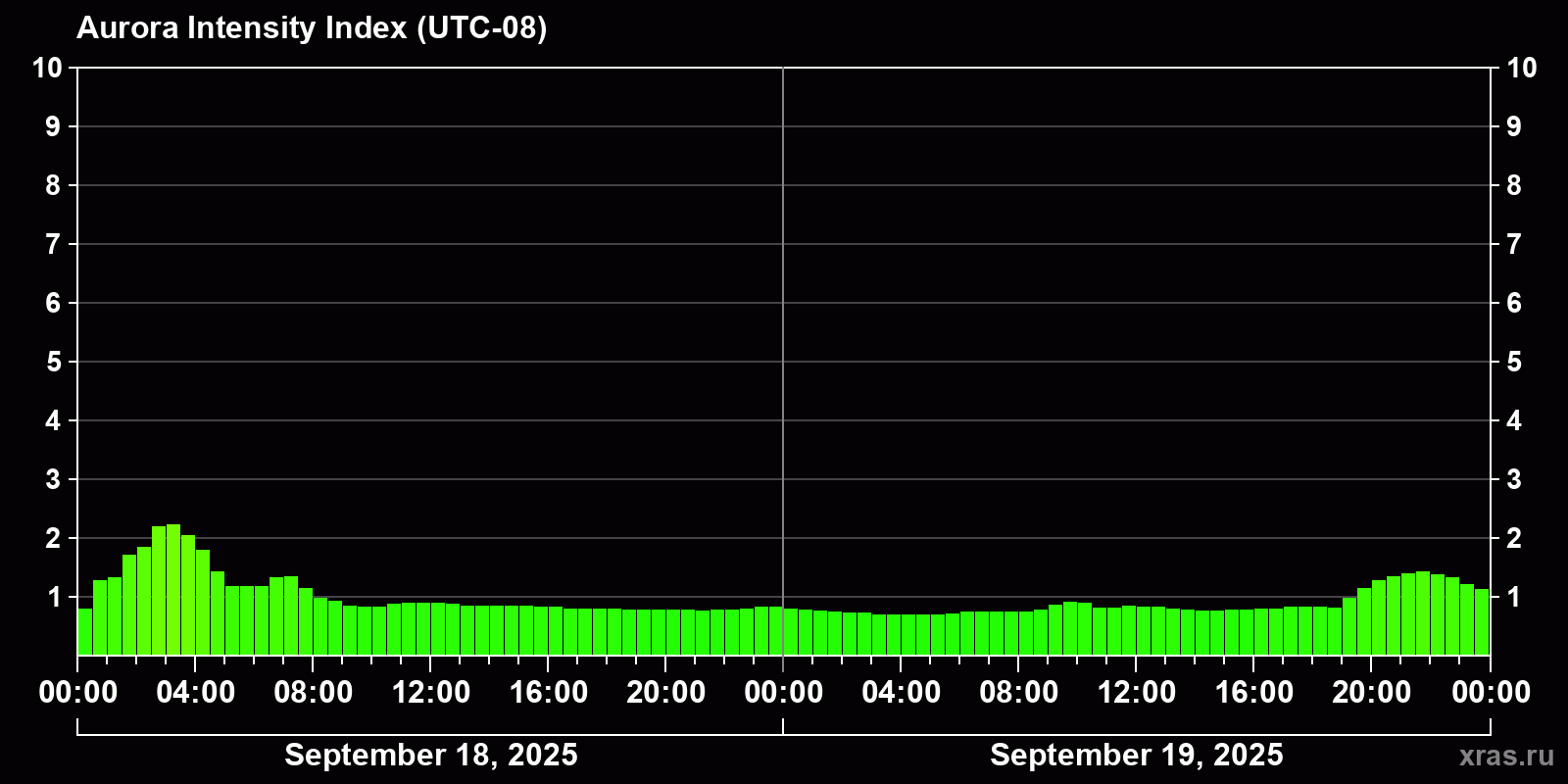 Changes in the auroral intensity index from 2025-09-18 to 2025-09-19 local time