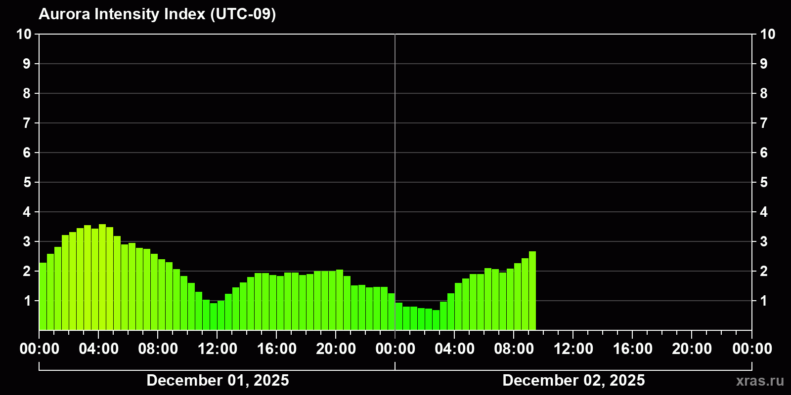 Auroral intensity index and the theoretically possible latitude of observations for nighttime in the Western Hemisphere as of 2025-12-02 08:13 (end of day) local time