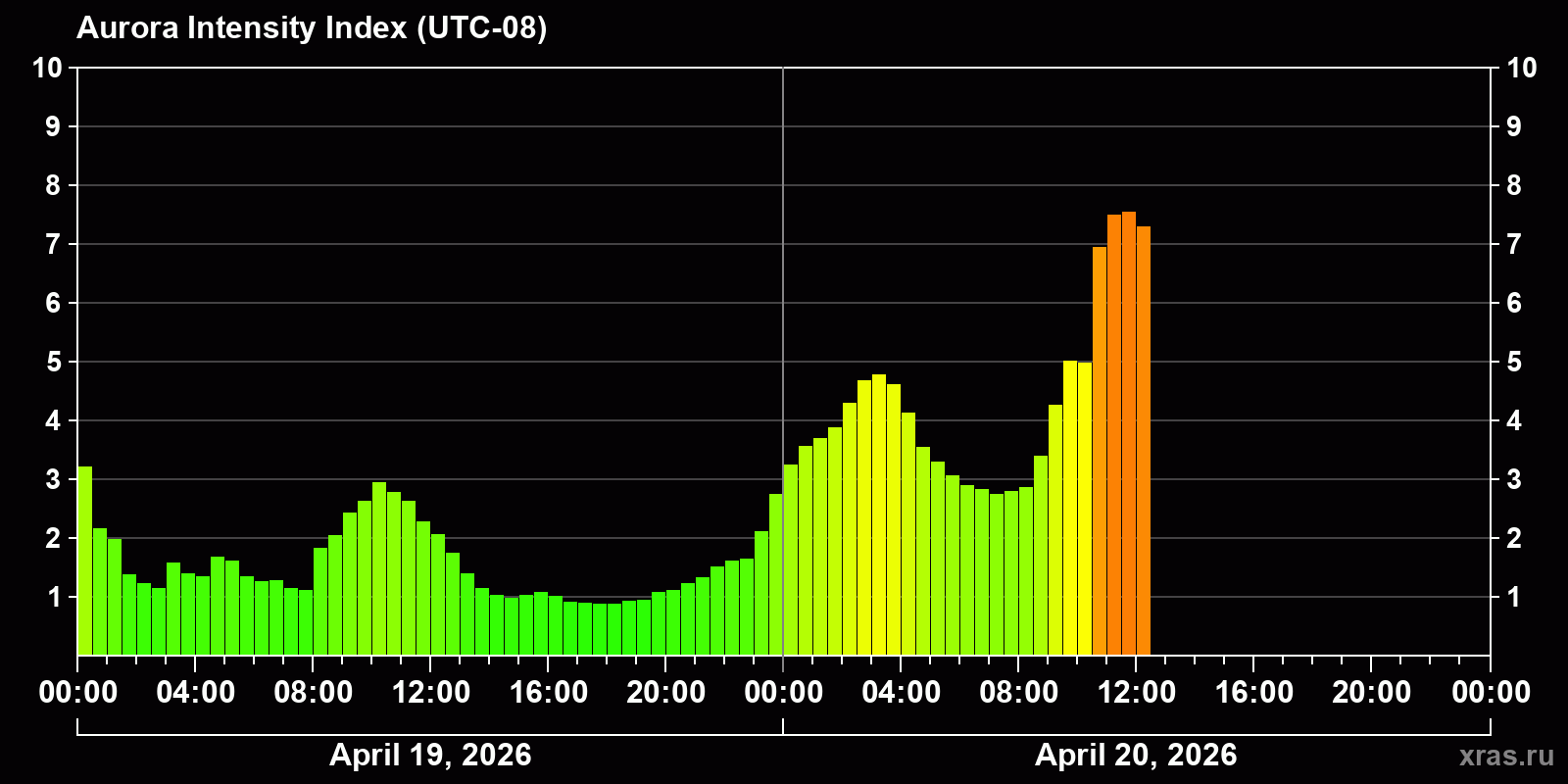 Auroral intensity index and the theoretically possible latitude of observations for nighttime in the Western Hemisphere as of 2026-04-20 10:46 (end of day) local time