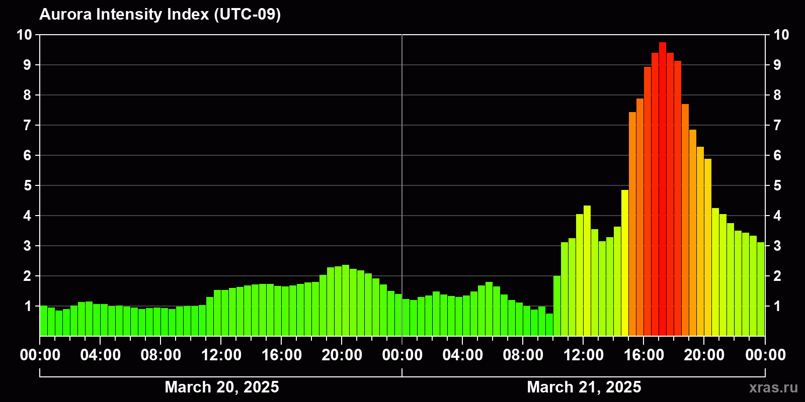 Changes in the auroral intensity index from 2025-03-20 to 2025-03-21 local time