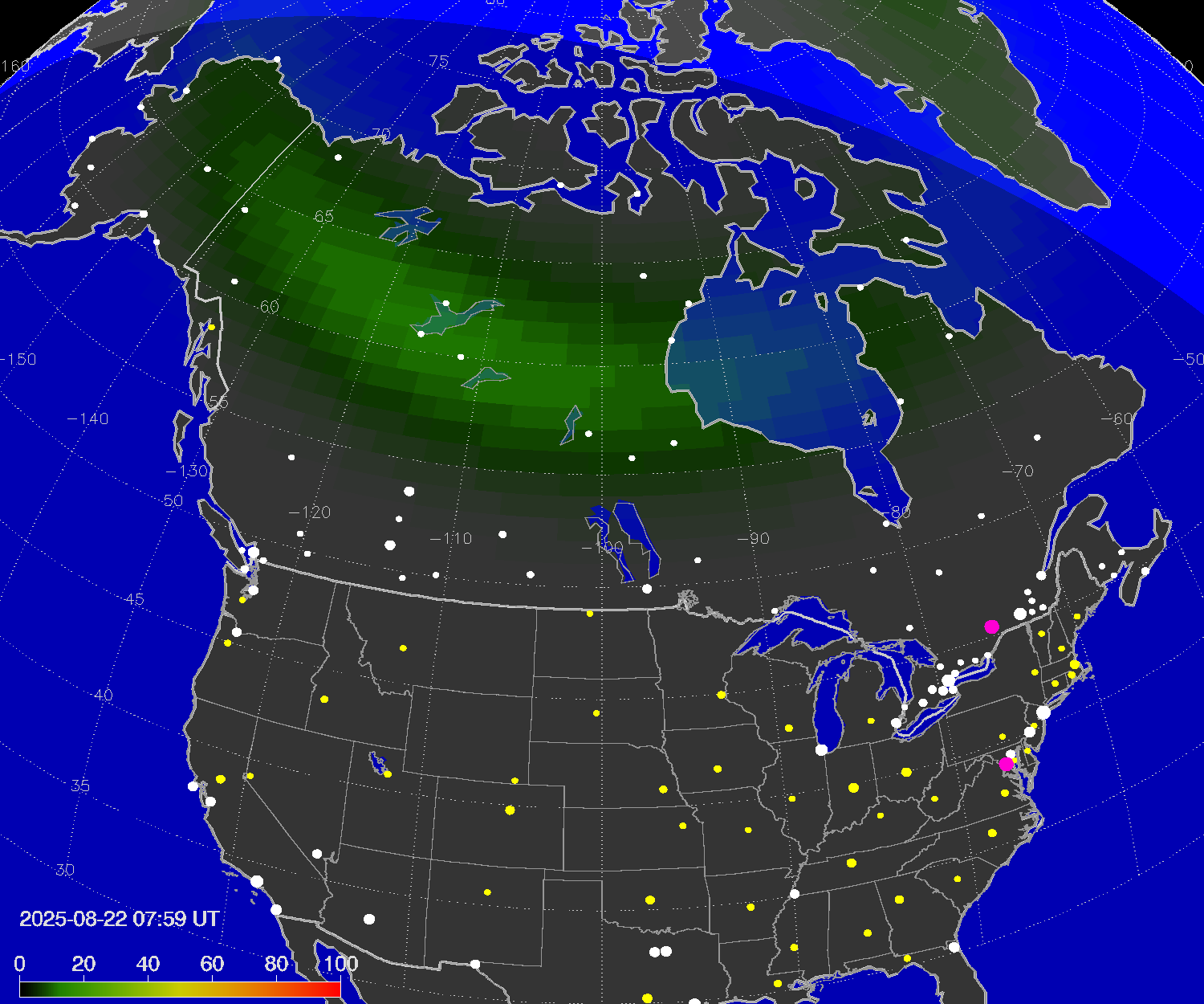 Probability of northern lights (auroras) in cities of United States