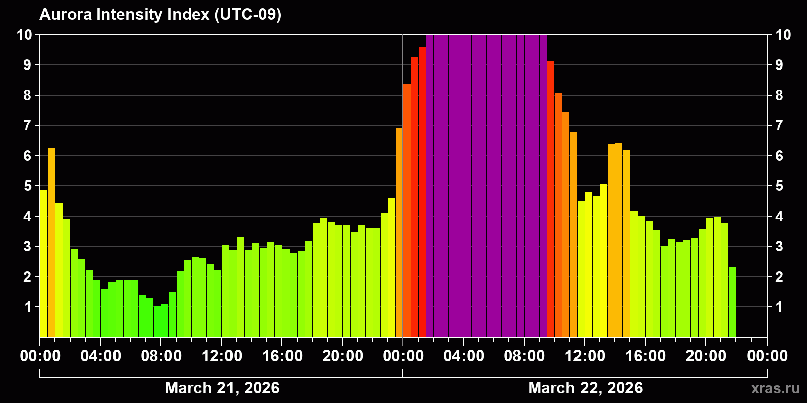 Changes in the auroral intensity index from 2026-03-21 to 2026-03-22 local time