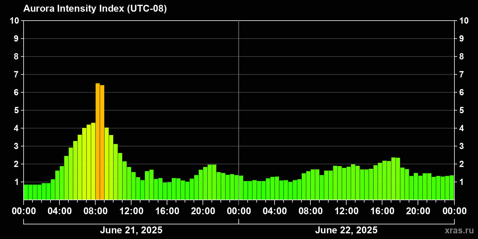 Auroral intensity index and the theoretically possible latitude of observations for nighttime in the Western Hemisphere as of 2025-06-22 23:57 (end of day) local time